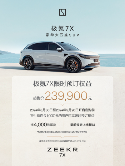 8月30日,第二十七届成都国际汽车展览会启幕。极氪携旗下全系车型亮相成都车展,并开启豪华大五座SUV——极氪7X全球首秀及预订,起售价23.99万元,在9月20日前支付意向金的用户,还将享受1000元抵4000元尾款的限时预订权益,并提前锁定上市权益。