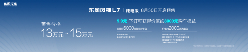 车展现场,东风风神营销事业部总经理师建兴介绍了东风风神L7纯电版的产品技术优势并公布预售权益:这款万众期待的人气新车预售价格为13万元-15万元。即日起至9月23日,9.9元预订即可享受价值约8000元购车权益,助力用户开启更加美好的拥车生活:价值约6000元智能舒享包:8155座舱系统+电动尾门(带位置记忆);价值约2000元流量包:享受5年免费娱乐流量(2G/月) ,额外赠送12个月(8G/月)娱乐流量,基础服务+OTA升级流量免费。优惠的预订价格与2大权益的叠加,意味着购车价值的全面升级,诚意十足。
