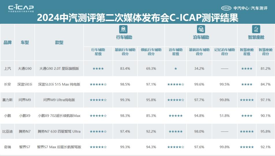 本次共发布6款车型测评结果,分别是大通G90、小鹏X9、深蓝SL03、腾势N7、问界M9和智界S7。按照C-ICAP(1.1版)进行测试评价:小鹏X9、深蓝SL03、腾势N7、问界M9、智界S7行车辅助获得“5星+”, 深蓝SL03、问界M9、智界S7泊车辅助获得“5星+”, 腾势N7、问界M9、智界S7智慧座舱获得5星。