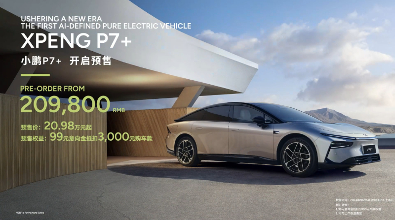 同时,小鹏汽车董事长CEO何小鹏也宣布,“全球首款AI汽车——小鹏P7+”正式开启预售,预售价格20.98万元起,预售权益99元意向金可抵3000元购车款。