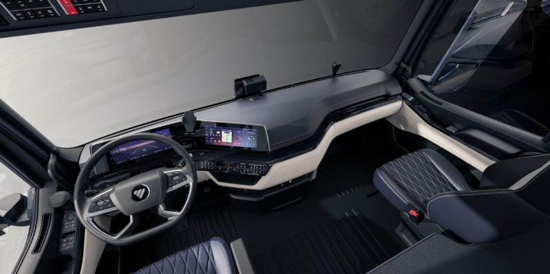 这其中,燃油发动机系列齐全、马力分布宽,排量从7L到 16L,马力覆盖240至680马力,能够适应不工况、场景,包括区域集散、干线、中长途运输等。燃气发动机同样全面升级,目前最大马力630PS,未来发动机马力将会提升到700PS,扭矩提升到3200N•m。变速箱方面,匹配采埃孚全新一代变速箱,从信息安全、节油、效率、智能化等做了全面升级,具备更强的工况适应。此外,打造全新智能EBP开关,B档下可以根据路况、车辆状态等,自动识别轻载、中载或重载状态,特殊场景下手动选择E模式或者P模式,真正实现一车多用;且5km行业最远高精度预见性驾驶,可以统筹规划车速、挡位、制动以及热管理等,让车辆始终处于最经济的运行状态,整体油耗可降低2-3%。