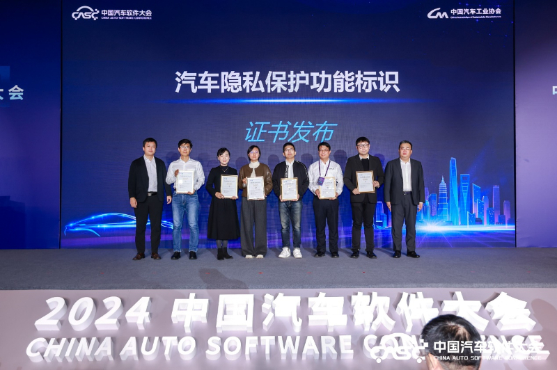 为规范汽车数据处理活动,五部委联合发布的《汽车数据安全管理若干规定(试行)》对汽车行业提出了数据安全要求。基于该文件和国标GB/T 41871,中国汽车工业协会与中国网络安全产业联盟汽车网络安全工作委员会联合国家级技术机构,制定了一套关于汽车隐私保护能力测评的规范。“汽车隐私保护”标识在2024中国汽车软件大会上正式发布,根据今年中国汽车工业协会发布的“关于汽车数据处理4项安全要求检测情况的通报(第一批)”,首批共有20余种车型通过测评,在本次大会上为首批通过测评的车型颁发证书。会上同时授权相应车辆使用“隐私保护”标识。