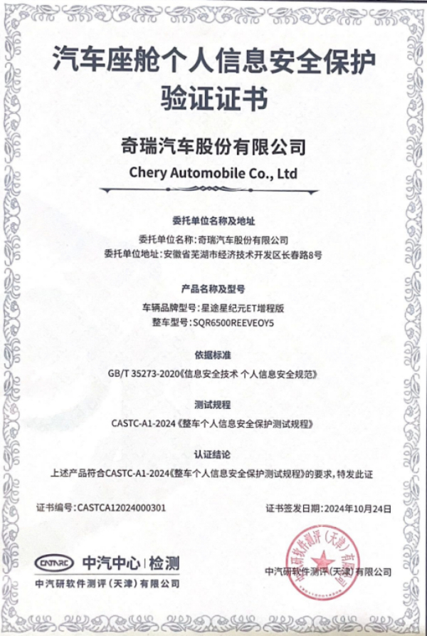 近日,在“软件与芯片融合技术创新暨第六届汽车软件测试工作组研讨会”上,奇瑞星途星纪元ET增程版成功获得由中汽研软件测评(天津)有限公司(简称“中汽软测”)颁发的《汽车座舱个人信息安全保护验证证书》,标志着奇瑞星途星纪元ET增程版成功通过汽车座舱个人信息安全保护测试验证,成为国内首批通过此项个人信息安全验证的车型之一。