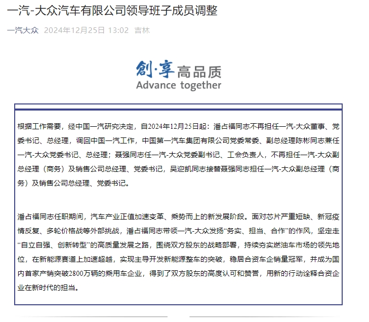 12月25日,一汽—大众发布了公司领导班子成员调整的公告。文中显示,根据工作需要,经中国一汽研究决定,自2024年12月25日起: