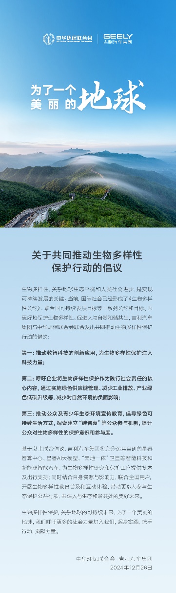 为了更好地保护生物多样性、呼吁更多公众重视并参与公益行动,吉利汽车集团与中华环保联合会联合发出《关于共同推动生物多样性保护行动的倡议》: