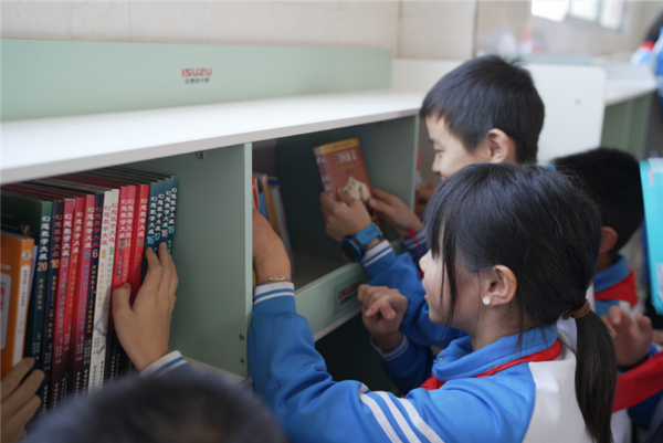 江西省萍乡市莲花县太岭村小学的小朋友得到心爱的图书分外喜悦。照片拍摄于2023年11月