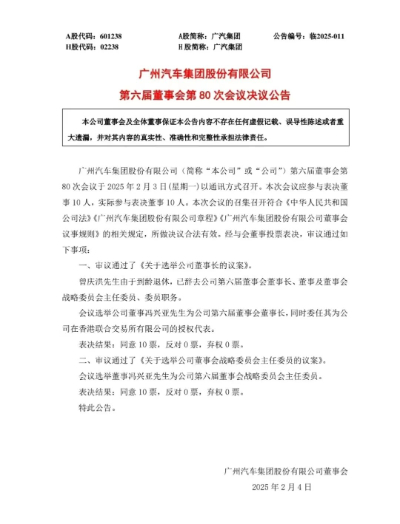 据广汽集团官方消息,2025年2月3日,广州集团第六届董事会第80次会议于以通讯方式召开。会议审议通过了《关于选举公司董事长的议案》。曾庆洪先生由于到龄退休,已辞去公司第六届董事会董事长、董事及董事会战略委员会主任委员、委员职务。公司董事会对曾庆洪先生在任职期间为公司发展所做的卓越贡献表示衷心的感谢。会议选举公司董事冯兴亚先生为公司第六届董事会董事长。