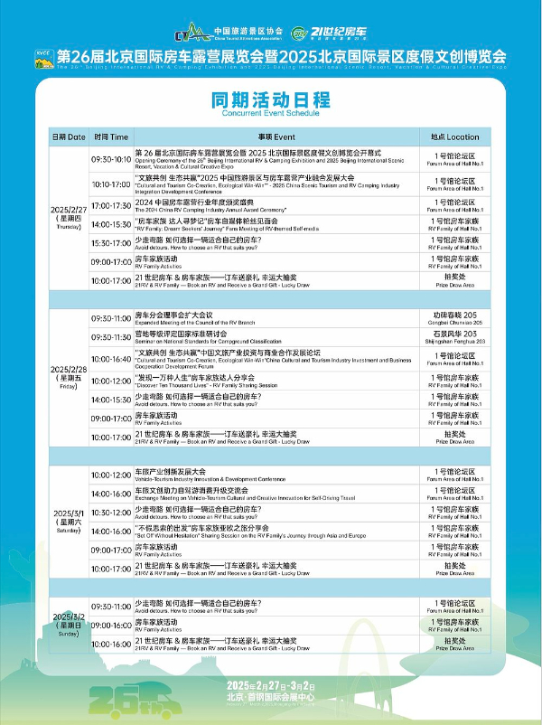 与此同时,展会期间将有一系列精彩纷呈的活动将轮番上演。行业发展大会、行业论坛、技术研讨会和新品发布会等活动,与会嘉宾们将共同探讨房车露营和景区度假文创产业的未来发展趋势和市场新机遇,为行业的持续健康发展提供宝贵的建议和思考。