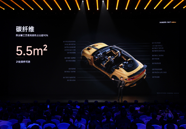 小米SU7Ultra的设计围绕巅峰性能展开,加入空气动力学套件,最大下压力可达285kg,媲美超跑级车型。全车满配共21处使用碳纤维,总面积达5.5m²,不仅更富运动感还有效实现轻量化。全系标配24k金碳纤维车标,黑金搭配,低调奢华。