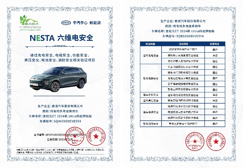 安全是最大的豪华。作为率先通过2024版C-NCAP五星认证的车型,星纪元ET基于全球五星安全标准打造,星纪元ET整车采用88%高强度钢铝结构,并采用多条传力路径和一体式门环结构设计,在高速碰撞中可保障A柱完好、乘员舱完整,动力电池零变形。值得一提的是,星纪元ET经过超1000次实车及模拟测试,在以25km/h以上车速行驶发生碰撞时,仅需10-20毫秒即可触发隐藏式门把手自动弹出解锁,弹出率与车门解锁率为100%。同时,星纪元ET前后车门内护板地图袋后侧均有应急机械开关确保车内乘员在紧急情况下可迅速逃生。在行业首次31.9米的高空“自由落体”实验中,坠地碰撞速度超过90km/h,星纪元 ET试验后乘员舱结构无明显变形,车门均能打开、气囊正常弹出,电池未漏液、无冒烟、不起火,出色试验表现彰显了星纪元ET作为一款豪华安全大五座SUV在主动安全、被动安全、电池安全等方面的超级安全实力。此外,星纪元也是“NESTA六维电安全”技术验证、全球首个增程车型行车控制安全认证、中汽中心整车功能安全产品认证及欧盟车联网安全管理双认证的车型,以实力成为全球用户信赖的“移动安全堡垒”。