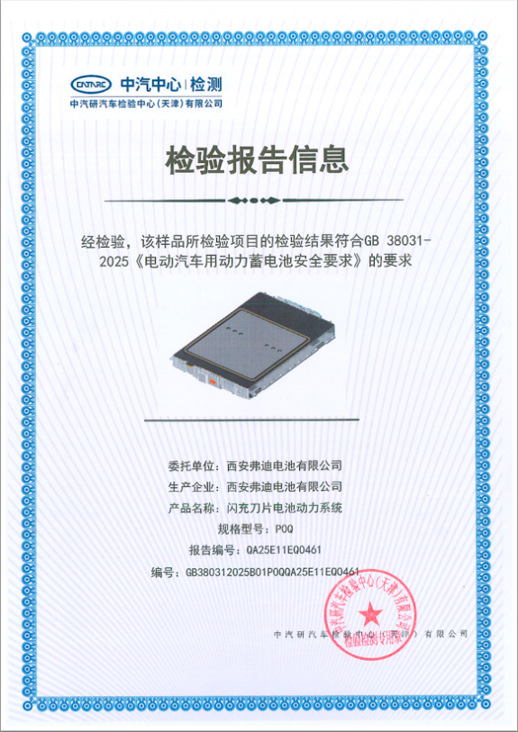 近日,比亚迪刀片电池和闪充刀片电池双双提前通过最新国标GB 38031-2025《电动汽车用动力蓄电池安全要求》全项检测,并获得中汽研汽车检测中心专业认证证书,提前满足新国标要求。