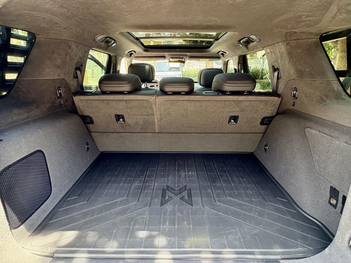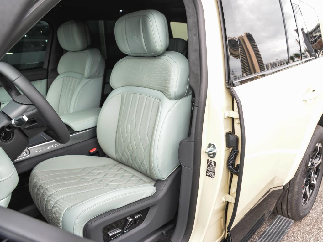 来到车内,猛士M817门把手依然延续了家族传承手枪握柄设计,在车门关闭时会模拟出手枪上膛的清脆“咔哒”声,将猛士的硬核军工气质瞬间转化为可感知的交互体验;全车内饰91.2%都采用豪华软包包覆,包覆面积达32㎡,人体与座椅接触面大面积采用Nappa真皮,皮质细腻触感舒适,这在硬派越野车内极为少见。落座前排,试驾者身高超1.8米头部仍有一拳半的余量,后排入座后膝部距前排靠背约有三拳距离,后排空间无压力。在空间上,猛士M817还带来了新的惊喜:第一排座椅移动到最前位置将头枕拆下后,靠背可放倒与后排座垫衔接成1.7m标准双床;第二排座椅可放平与行李厢地毯形成2.1m舒享大床。无论是对于远游出行还是午休小憩,都可以把车当作移动主卧,随时随地享受躺平的惬意。后备厢容积达828L,全车共有24个储物空间,可科学分区灵活储物,可以说M817整车空间完全满足了用户对乘用空间和装载空间的双重需求。