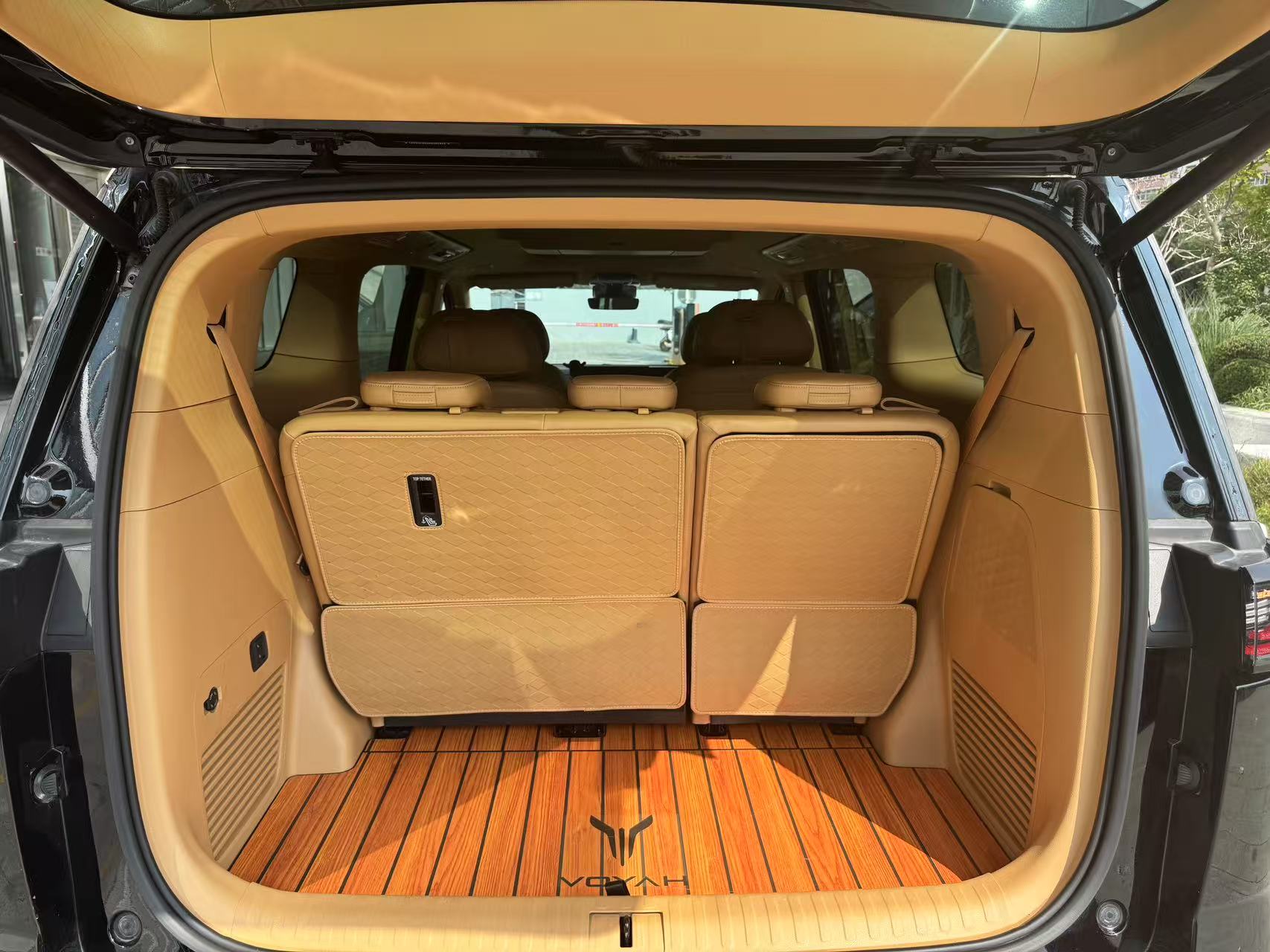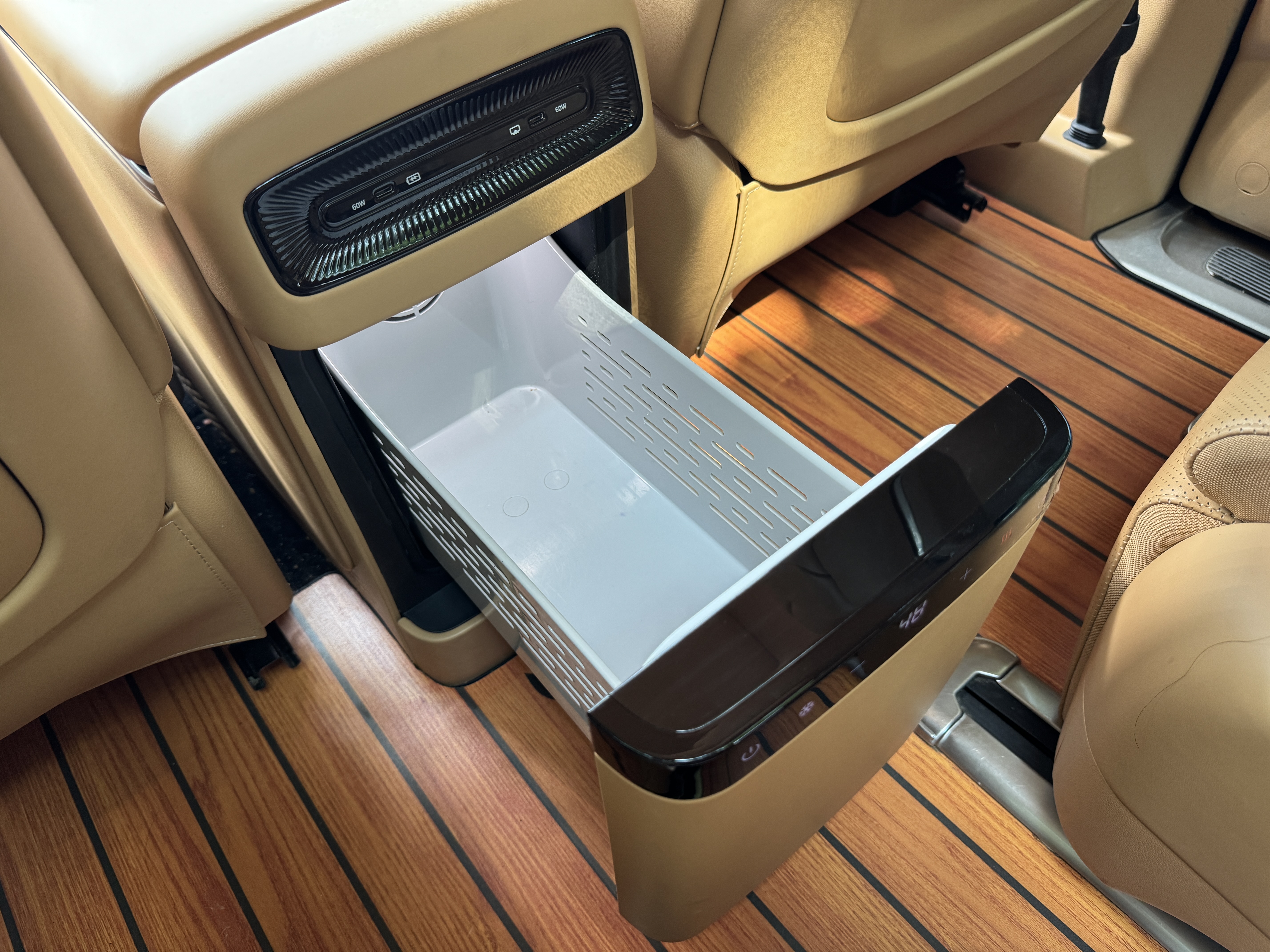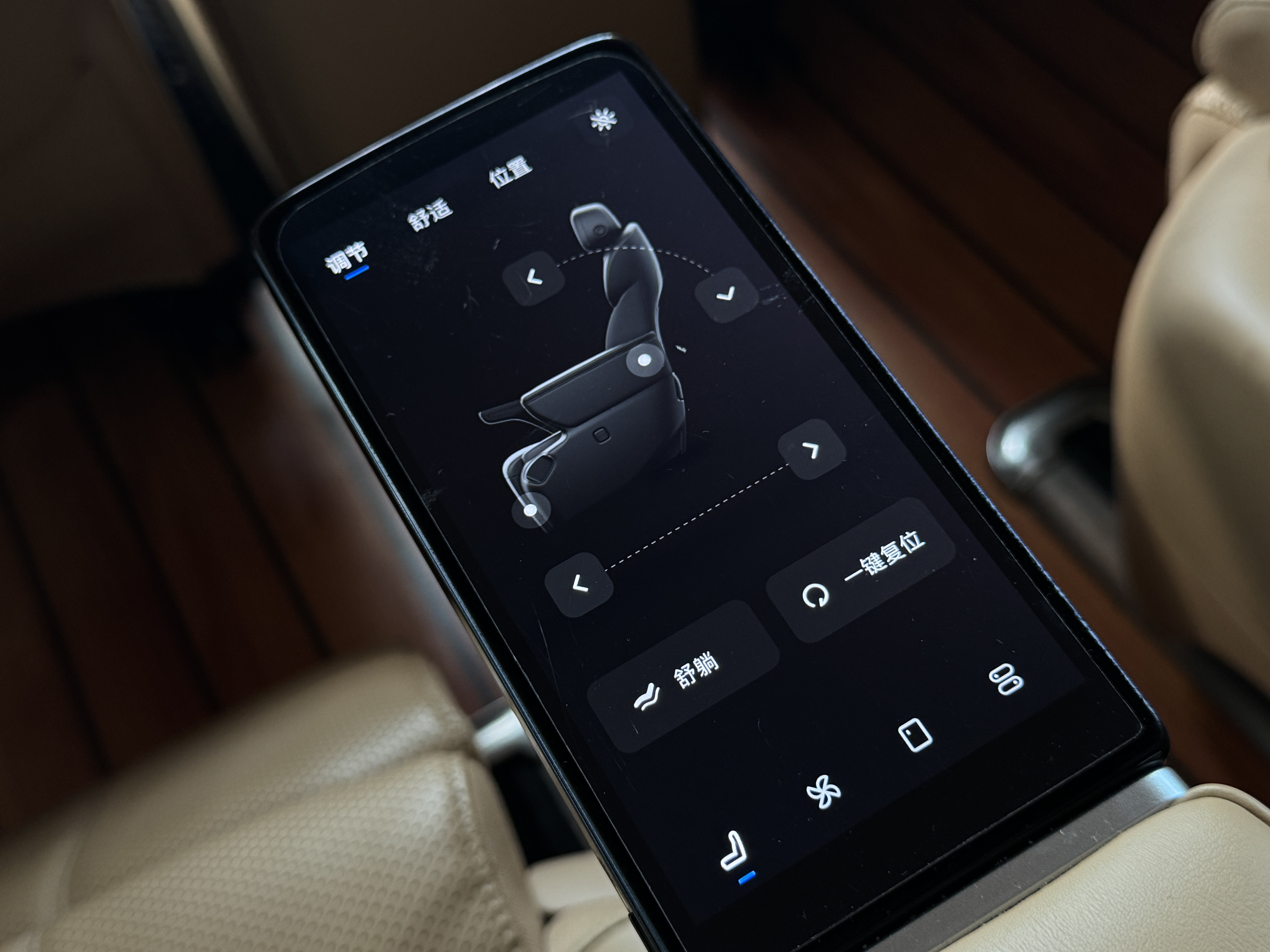 第二排座椅扶手处的智能控制板支持座椅电动调节、加热、通风、按摩等功能,一键模式下可将腿托完全展开,配合13L冷暖双用冰箱与17.3英寸娱乐屏,让长途旅行成为一种享受。此外,第三排座椅在满员状态下仍能保证一定的头部空间和腿部空间,提升乘坐舒适性。