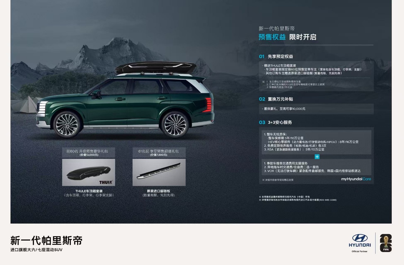 除了诚意十足的售价,现代汽车还同步推出了专属预售礼遇,包括先享预定权益:前60位预订用户将获赠THULE车顶箱套装,其他订购车主则可获得原装进口脚踏板。此外,置换客户还可享受至高10000元的补贴。更贴心的是,针对进口车配件费用高、维修周期长、维修网点少等用户痛点,现代汽车在原有三大售后服务基础上,特别推出“3+3安心服务”,致力于为用户提供更高品质的用车体验。