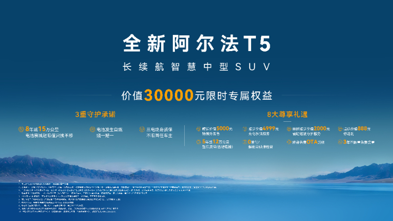 据了解,即日起下订新T5,用户还可以享受价值3万元限时专属权益。此外,极狐新T5承诺“三电终身质保、电池自燃烧一赔一、8年或15万公里内电池衰减低于70%只换不修”。