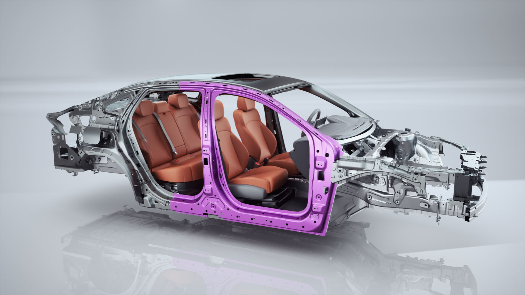 整车采用潜艇级笼式车身,高强度钢占比达70%,最高抗拉强度超1500MPa,车身扭转刚度高达26000N·m/deg,奠定驾驶安全基石。前机舱配备“B”型截面超高强钢防撞梁与240mm超长吸能盒,后防撞梁采用“C”型超高强钢+200mm渐变吸能盒,结合S形两折弯吸能设计与同级独有发动机下沉技术,在碰撞中有效引导能量传递,保障乘员舱完整。
