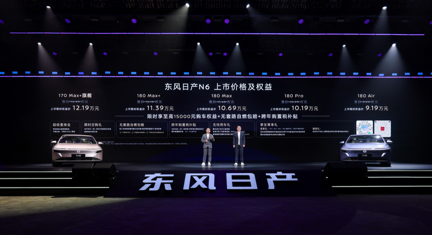 12月1日,以“NI好,插混新势力”为主题的东风日产N6上市发布会在广州举行。东风日产天演架构下的首款插混车型——东风日产N6正式上市。新车定位“大电池超舒适中高级插混轿车”,凭借王牌产品硬实力、越级智能软实力、央企合资高品质三大核心优势,重新定义插混轿车新标准。此次,东风日产N6推出了180Air、180Pro、180Max、180Max+、170Max+旗舰共5个版本,售价区间为9.99-12.99万元。