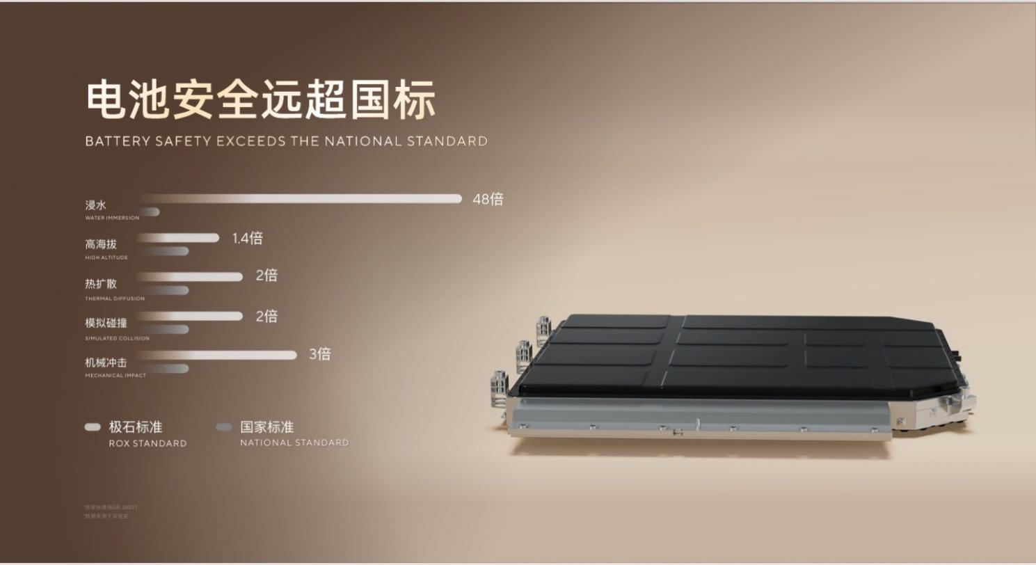 极石ADAMAS搭载REEV超级增程系统,采用全时四驱设计,双电机最大功率可达350kW,峰值扭矩740N·m,百公里加速仅需5.5秒。新车配备44.5kWh宁德时代电池与70L大油箱, 可实现215km纯电续航与1405km综合续航(CLTC),真正实现全场景里程无忧。
