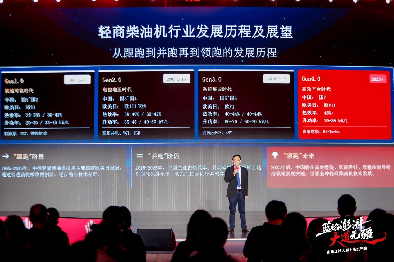 作为本次发布会的核心亮点,全新江铃大道基于全面进阶的巡天架构2.0打造,实现了从动力、底盘到智能的全维度突破。沈彬指出,蓝焰发动机是第四代轻柴的能力集成,将高效、响应、耐久做到极致。