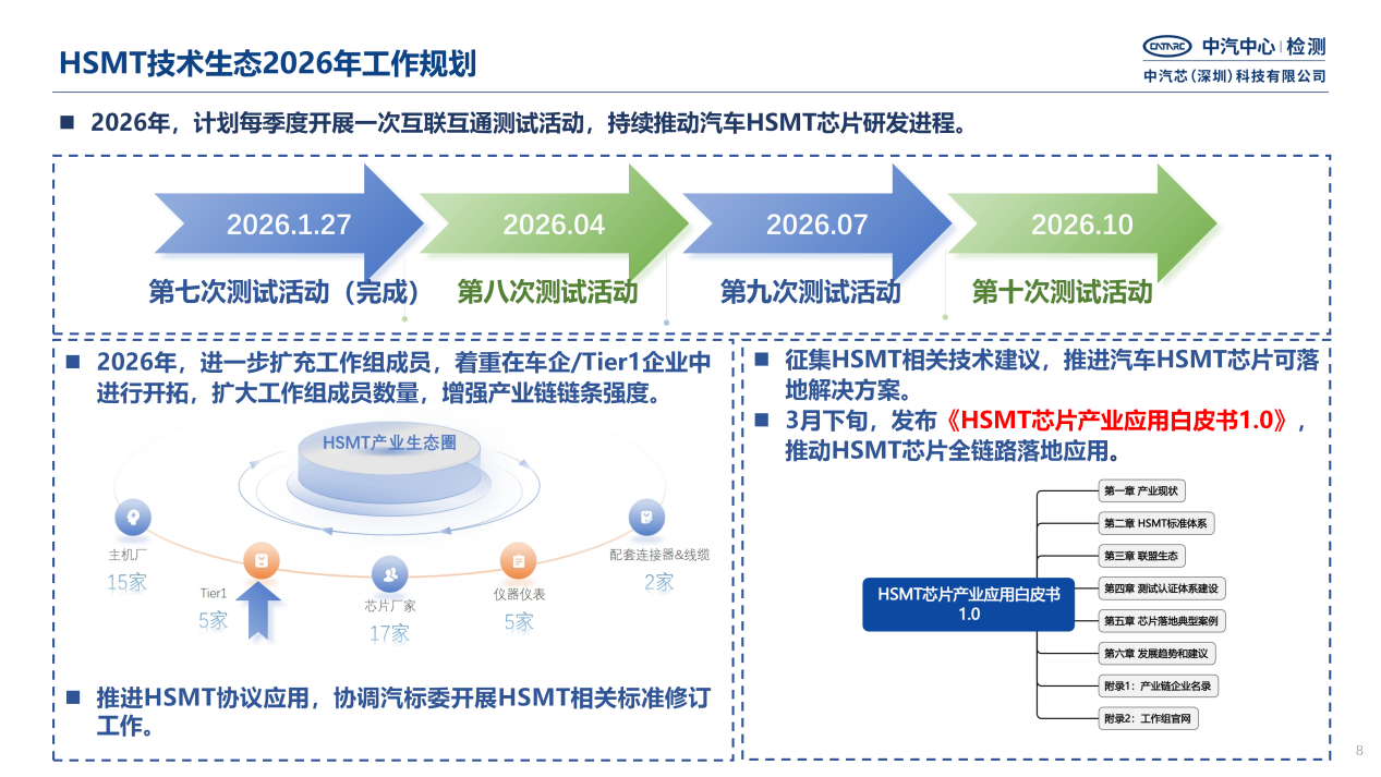 作为汽车芯片HSMT工作组组长单位,中汽芯(深圳)科技有限公司同步发布了2026年HSMT技术生态工作规划:持续推进HSMT协议应用,支撑全国汽车标准化技术委员会开展相关标准修订;每季度开展互联互通测试活动,加快芯片研发与验证迭代;进一步扩充工作组成员,重点结合车企和零部件企业应用需求,完善多场景落地解决方案,构建更加开放开放协同的HSMT产业生态。