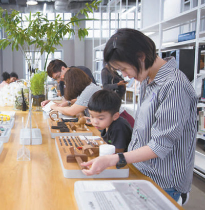 除了大量设计类书籍杂志,图书馆还为来访者设立了专门的材料体验区和展览区域。图书馆二层设置了亚洲最大的材料馆。在这个1000多平方米的展室内,约2000种布料、木材等原材料样本分门别类进行展示。人们在此可以看到生活中大部分物品的设计原料。在一层,工作人员开辟了泰国当代材料艺术展室,泰国青年艺术家或艺术专业的学生可租用这里的场地举办作品展。此外,图书馆还会在这里不定期举办艺术类讲座、培训等活动,为设计专业人士和爱好者提供了交流学习的机会。