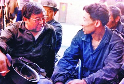路遥(左一)在鸭口煤矿与矿工们交谈。
