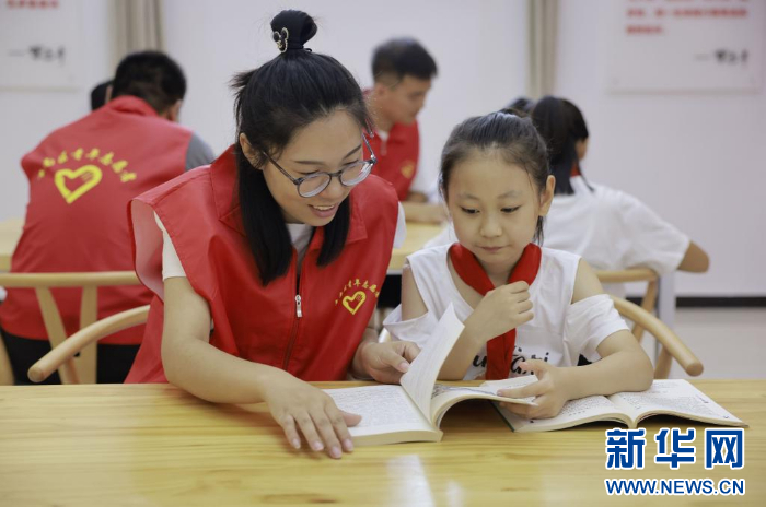 8月4日,唐山市丰南区青年志愿者在孔家庄村农家书屋陪伴小朋友读书。 为丰富暑期生活,唐山市丰南区依托农家书屋,组织青年志愿者开展“专业伴读”活动。孩子们在志愿者的指导和陪伴下,培养阅读兴趣、享受阅读快乐。 新华社发(李秀清 摄)