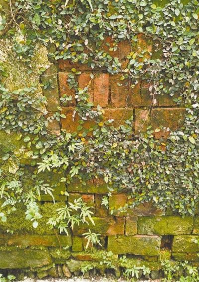 在走回家的路上,我有意绕来绕去多走了几条巷子。为的是再多读几段老墙。有一座土墙矮房,早已被主人遗弃,劣筑的红土墙面上夹杂着石块草根。而一坡青瓦斜披而下,瓦上长满嫩绿的厚厚的苔藓。苔藓这东西很有意思,不管是老砖、旧瓦、朽木、断墙,都一律公平地给穿上鲜亮的绿装。现在这绿苔青瓦的屋檐压得很低,直遮住了老土墙的额头。而墙脚正绽放着一束灿烂的花。