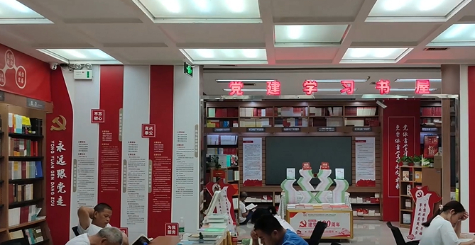 “学习强国”线下体验空间主题党建学习书屋位于新华书店二楼,包含党建读物、红色经典、行政参考、政治、国际政治等类型书籍,书屋藏书种类规模超过1000个品种,丰富多样的阅读内容提供给不同需求的读者。