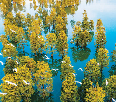 大汉塘有些历史了,相传是三国时期刘备在此建造城池挖建的,经历朝历代不断扩建,形成如今的模样。奇特的是,湖心有一片挺拔高大的池杉林,葳蕤的枝丫上栖息着许多水鸟。