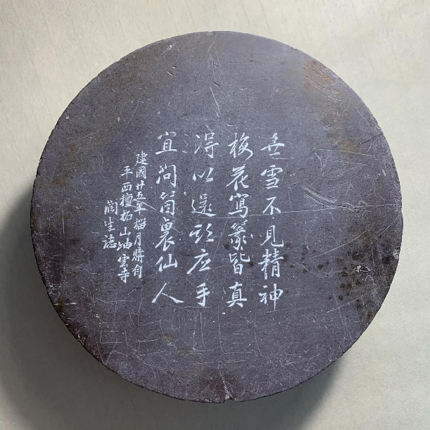 文革时期,易礼容受到迫害并被关进秦城监狱。1974年,经多方工作,易礼容终于得以出狱。当年5月,易礼容游京西名刹潭柘寺,喜遇一方著名的柘紫石砚,具有深厚国学功底的他当然识货,当即解囊买下。京西九龙山的老虎山,今门头沟区潭柘寺镇阳坡村附近,古产一种紫红色石砚,历为书家所喜爱。该石因含铁丰富,故色泽紫红,多为宫廷所用。其砚石质细腻,晶莹温润,研之无声,易于发墨,为书家所钟爱。易礼容购得此砚,回家后反复把玩,爱不释手,即赋诗一首,并题刻于砚盖: