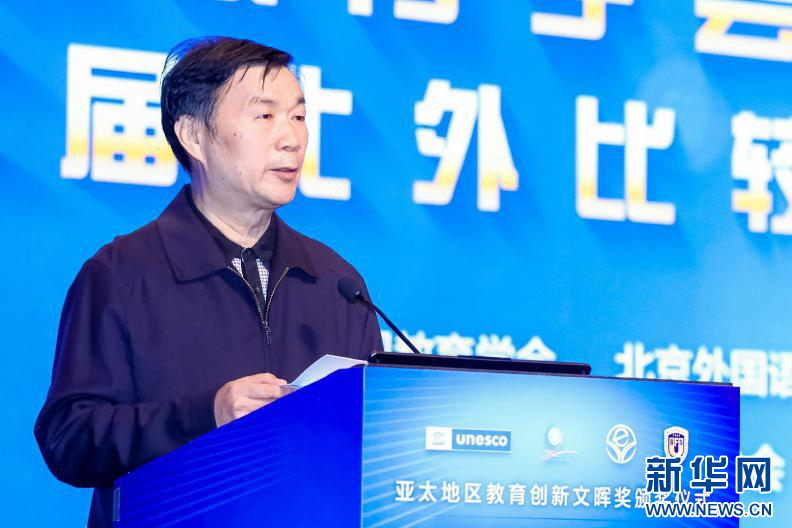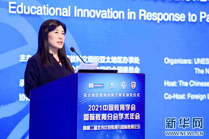 随后,大会举行了亚太地区教育创新文晖奖颁奖仪式。亚太地区教育创新文晖奖是由联合国教科文组织发起,由联合国教科文组织亚太地区教育局与中国联合国教科文组织全国委员会联合设立的国际性奖项,旨在表彰亚太地区在教育创新发展方面做出杰出贡献的教育工作者或教育机构。中国联合国教科文组织全国委员会秘书长秦昌威,联合国教科文组织亚太地区办事处教育创新与技能开发部主任汪利兵,北京外国语大学外研集团党委书记、董事长,外研社社长王芳分别致辞。汪利兵为“文晖奖”获得者颁发获奖证书。