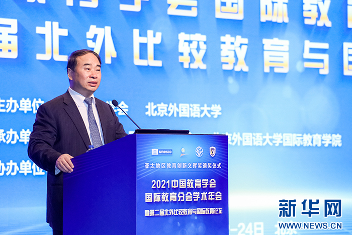10月23日,由中国教育学会、北京外国语大学主办,中国教育学会国际教育分会、北京外国语大学国际教育学院、外语教学与研究出版社承办,北京外国语大学国际教育集团协办的“亚太地区教育创新文晖奖颁奖仪式·2021中国教育学会国际教育分会学术年会暨第二届北外比较教育与国际教育论坛”在北京开幕。来自国际教育领域专家、资深教育参赞及300余位研究者、从业者参加本次论坛。