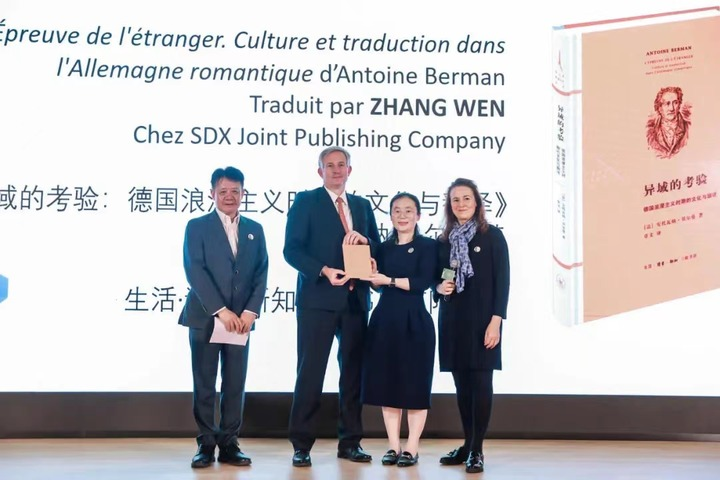 法国驻华大使罗梁(左二)为社科类获奖译者颁奖。法国驻上海总领事馆供图