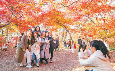 游客栖霞山留影。苏阳 摄(人民图片)