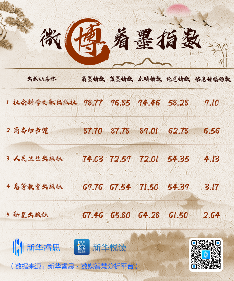 新华睿思·揽书指数榜单以中央级图书出版单位为切入点,基于新华睿思百亿数据资源池,对各出版单位在包括微博、微信、抖音、头条在内的国内社交媒体平台进行传播数据追踪,并通过“睿思+”权重对主要数据指标进行加权计算,综合得出新华睿思·揽书指数,为内容出版机构提供信息参考。