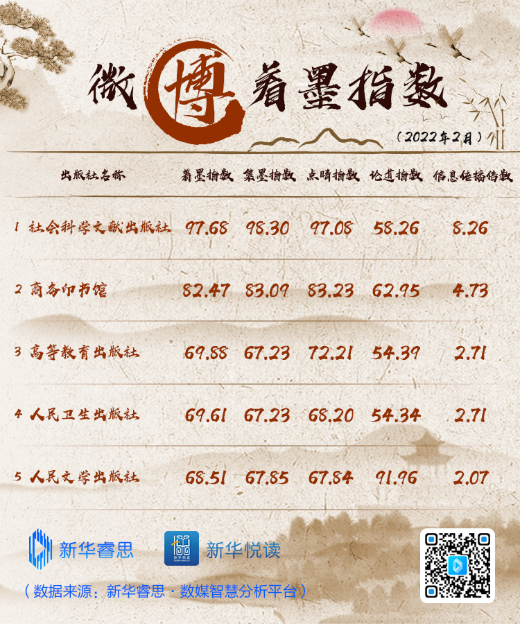 新华睿思·揽书指数榜单以中央级图书出版单位为切入点,基于新华睿思百亿数据资源池,对各出版单位在包括微博、微信、抖音、头条在内的国内社交媒体平台进行传播数据追踪,并通过“睿思+”权重对主要数据指标进行加权计算,综合得出新华睿思·揽书指数,为内容出版机构提供信息参考。