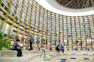 几位市民在北京建工“璟玥林汐美学艺术馆”内阅读。卜向东摄/光明图片