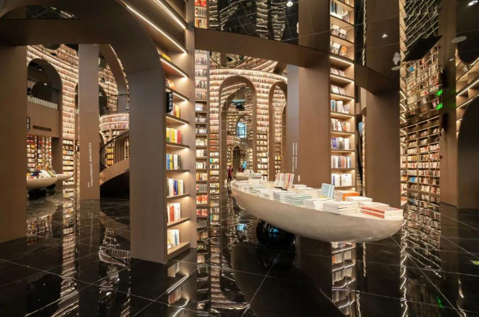 钟书阁是都江堰首个文旅主题的书店,其灵感来自宏伟的都江堰水利工程。书桌宛如湖面停泊的小船、书架形似砖石砌起的大坝、镜面吊顶仿佛波光粼粼的湖面,钟书阁用当地元素给读者融合出了一个全新的阅读空间。