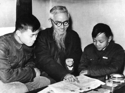 1955年,宋菲君(右)与外公丰子恺(中)一起读报。