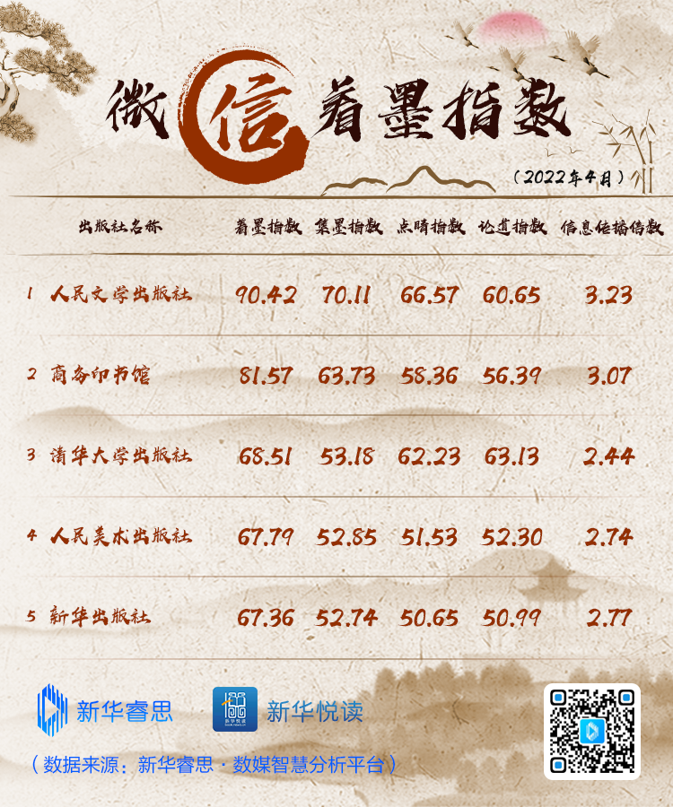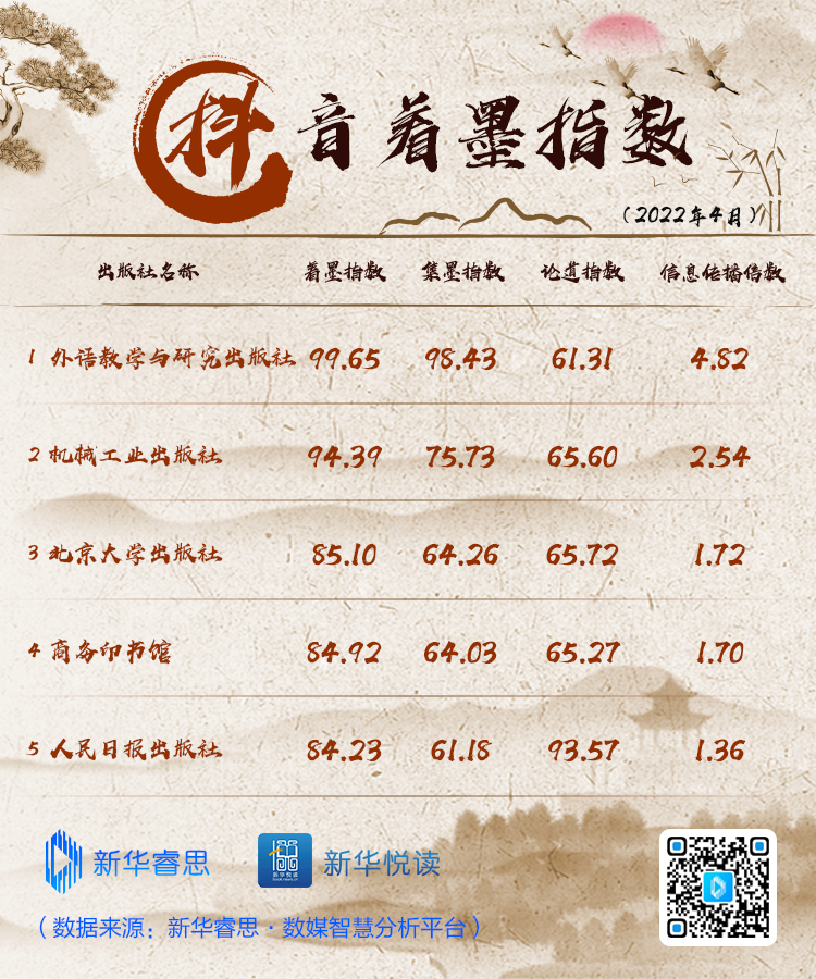 新华睿思·揽书指数榜单以中央级图书出版单位为切入点,基于新华睿思千亿数据资源池,对各出版单位包括微博、微信、抖音、头条在内的国内社交媒体平台进行传播数据追踪,并通过“睿思+”权重对主要数据指标进行加权计算,综合得出新华睿思·揽书指数,为内容出版机构提供信息参考。