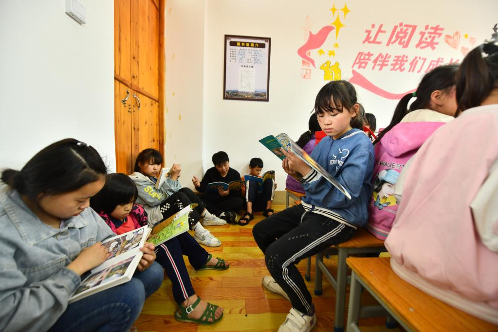 骨龙村小学学生在图书室阅读(5月25日摄)。