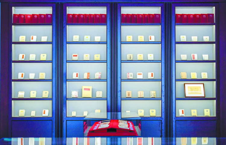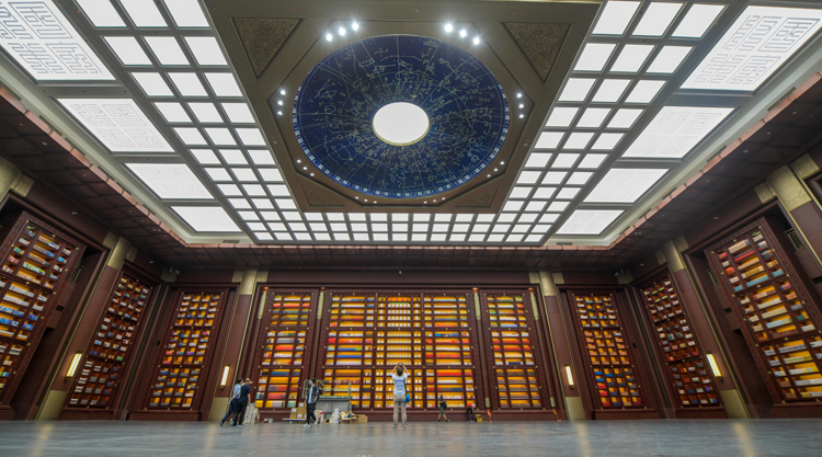 走进位于国家版本馆主建筑文华堂的国家书房,抬头就能看到宋代碑刻天文图的星空穹顶。国家书房内陈列着具有传世价值的经典出版物版本。