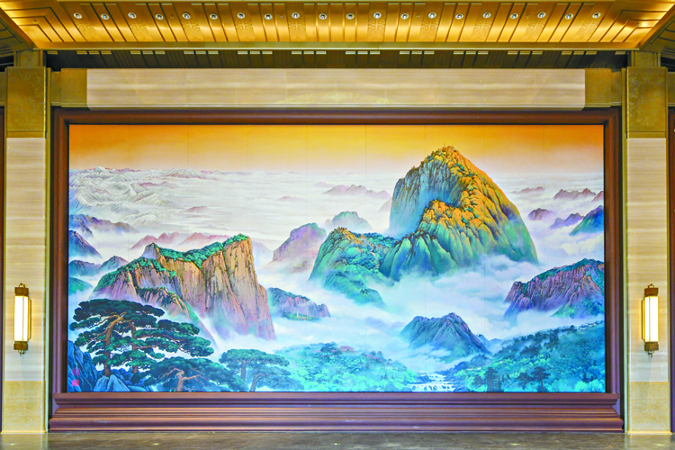走进文兴楼一层文兴厅,映入眼帘的是气势磅礴的壁画《山河揽胜》。