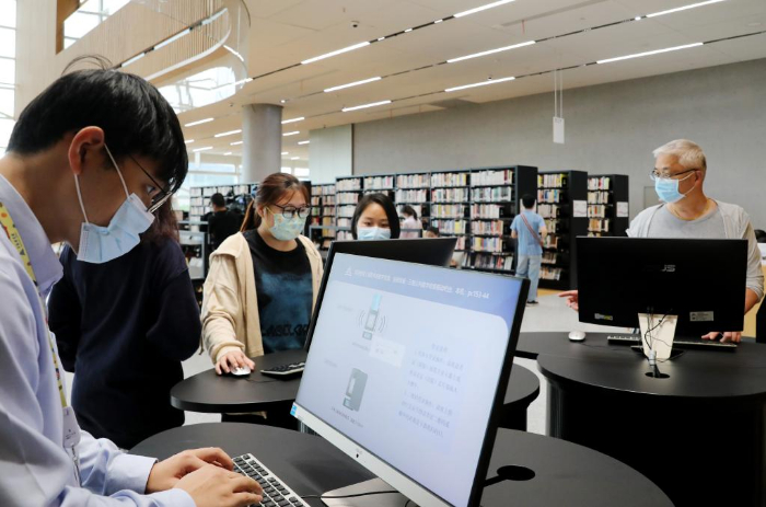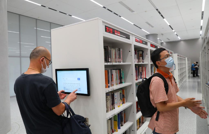 9月28日,读者在智能书架区通过安放在书架上的电脑查询书籍。