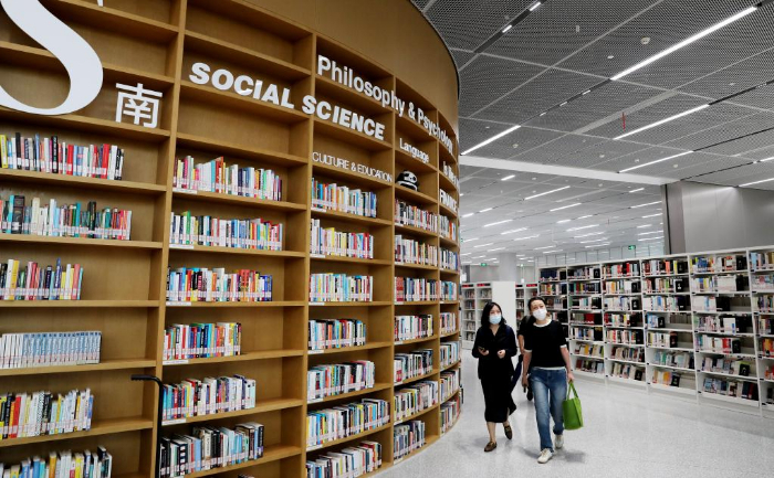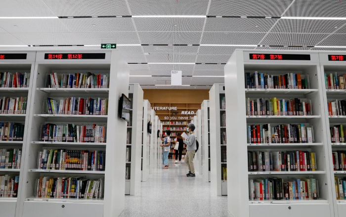9月28日,读者在上海图书馆东馆内一个开放式书架前浏览书籍。