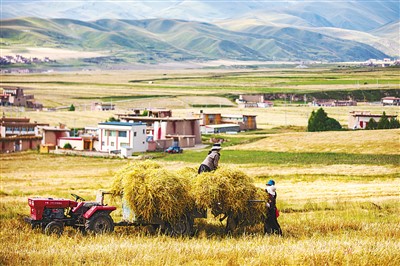 秋天的平原、河谷、山野里,大片大片的青稞翻滚着麦浪,金黄耀眼,如同一块块黄色、喜悦、飘飞着麦香的金色云朵,绵延到天与地的尽头。农民在麦田间忙着弯腰、挥镰、系起青稞束,红脸蛋绽满喜悦,向大地和来往的人诉说着大自然的馈赠。高原上人们脸上的“高原红”是地理、气候环境等造成的面部红血丝,但没有人会否认,这也是一种勤劳的美。在阿坝县,这种勤劳与汗水浇灌出累累硕果:青稞、蔬菜、中药材、牧草等基地规模达12.3万亩,年接待游客近100万人次,农村居民人均可支配收入增长9.7%……