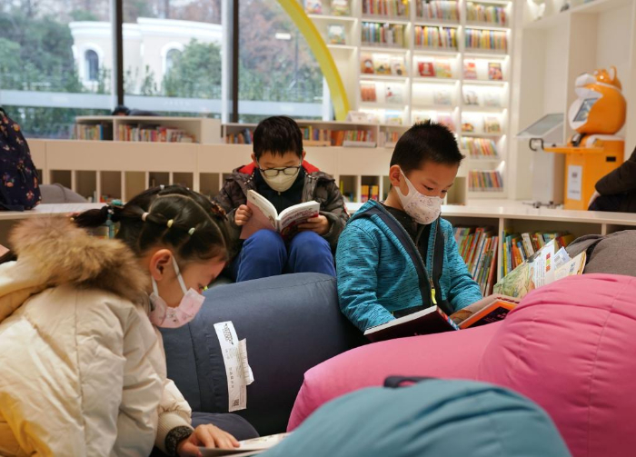 1月1日,孩子们在徐家汇书院的少儿阅读区读书。