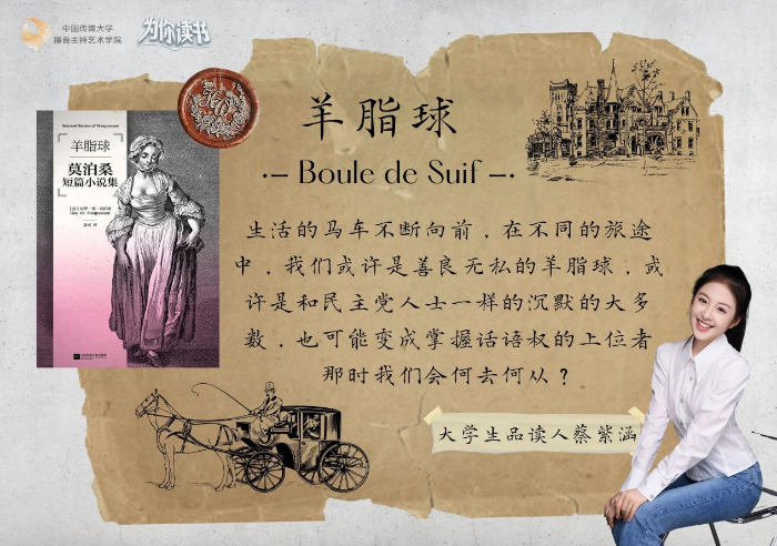 新华悦听,值得一听,大家好,我是大学生品读人来自中国传媒大学播音主持艺术学院的蔡紫涵,今天要和您分享的是莫泊桑短篇小说集《羊脂球》。