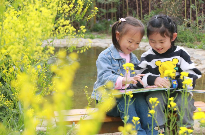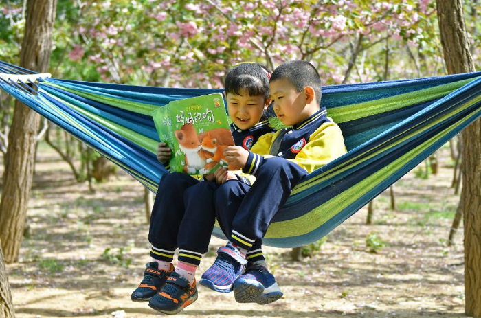 4月21日,在山东省高密市密水街道中心幼儿园,孩子们在校园里读绘本故事。